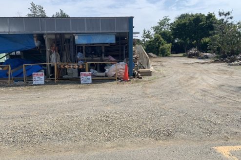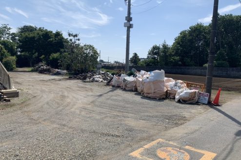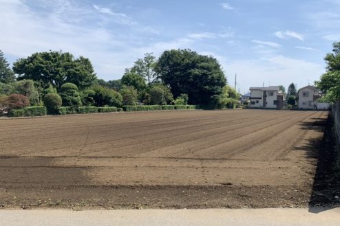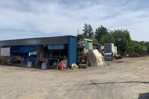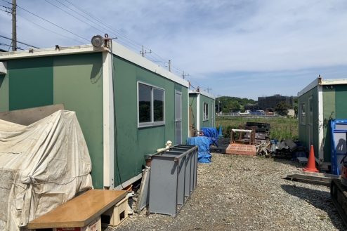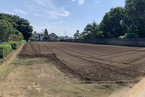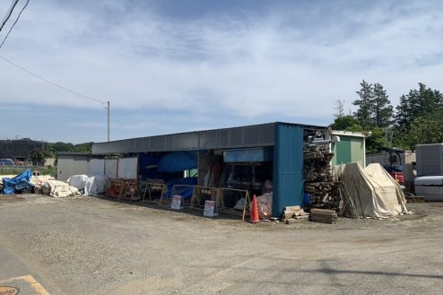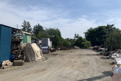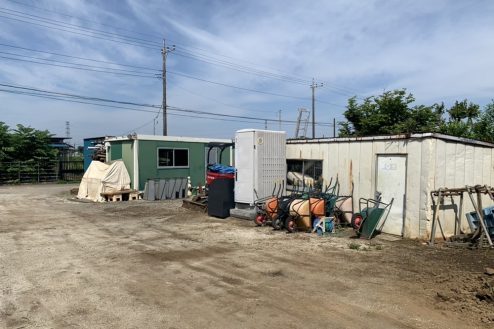 造園会社の資材置場と畑。広い敷地にスーパーハウスやプレハブ小屋が置かれた資材置場は工事現場や建築作業シーンにも。広い畑は農業や農家のシーンに最適です。